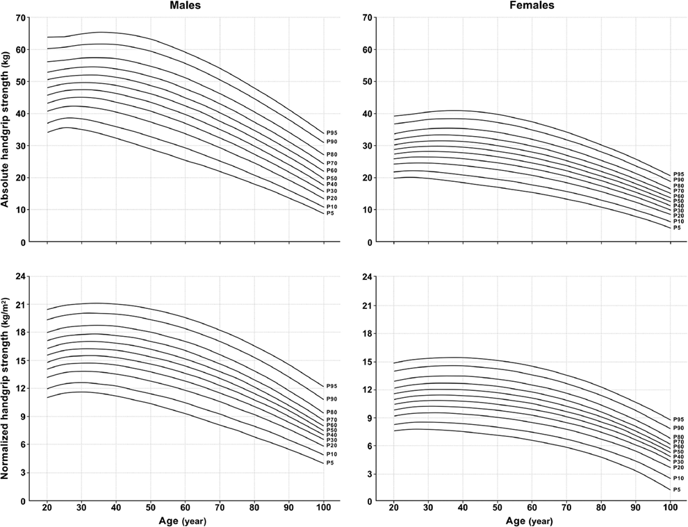 Smoothed percentile curves (P5 to P95) for handgrip strength in kilograms (kg) and normalised handgrip strength (handgrip strength in kg divided by height in meters squared (kg/m2)) for adults aged 20 to 100+ years (from: International norms for adult handgrip strength)